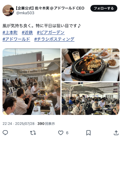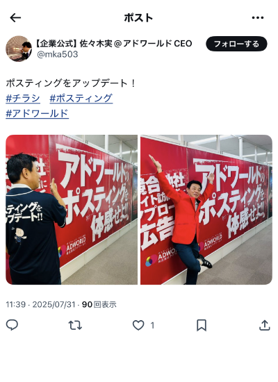 社長+社員様に X(旧Twitter) へ出演(写真のみも含む) をいただく 《ポスティング業あるある》 《仕事内容あるある》 《作業現場公開》 《社内行事公開》 レポートをもとに週1配信を徹底、SNS経由の新規受注が爆発的に増えました